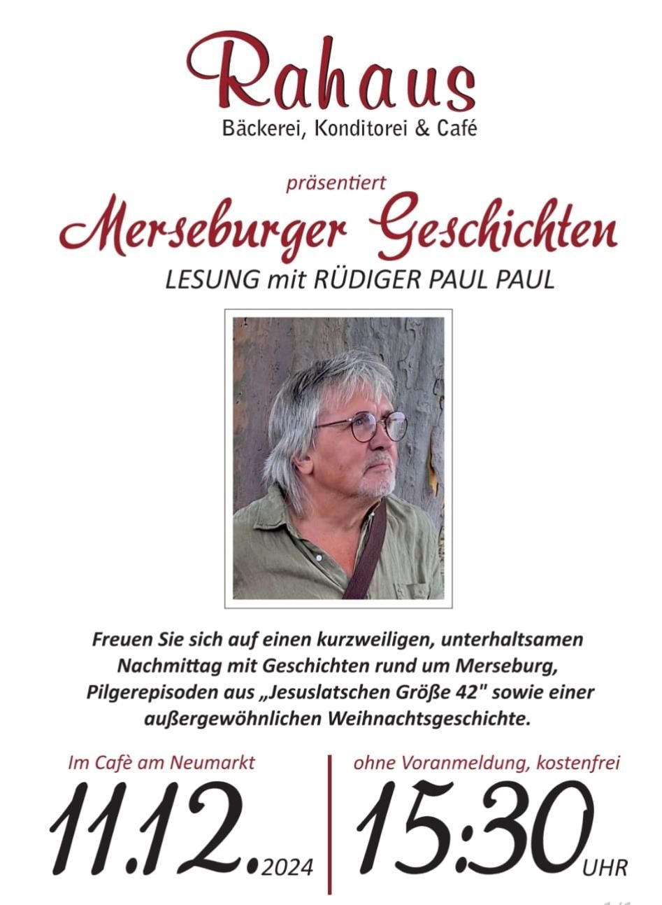 Rüdiger Paul Paul 1959 in Bad Lauchstädt geboren, seitdem ist Merseburg meine Heimat für Schule, Lehre, Beruf, Familie und Freizeit. In den eingefügten beruflichen „Wanderjahren“ war Merseburg stets der Mittelpunkt. Man muss seine Stadt schon lieben, wenn man über sie Geschichten schreiben möchte. Merseburg hat sich mir ganz allmählich, über all die vergangenen Jahre erschlossen. Das spiegelt sich in einigen meiner Geschichten wieder. Außer dem Schreiben, bin ich gern unterwegs, fotografiere, höre Musik, gestalte unseren Garten, treffe mich mit Autoren im „Leseturm“ und arrangiere mich im „I-Team“ des OK-Merseburg. Mit Lesungen und kleinen Ausstellungen möchte ich meiner Heimatstadt einen kulturellen Beitrag zurückgeben